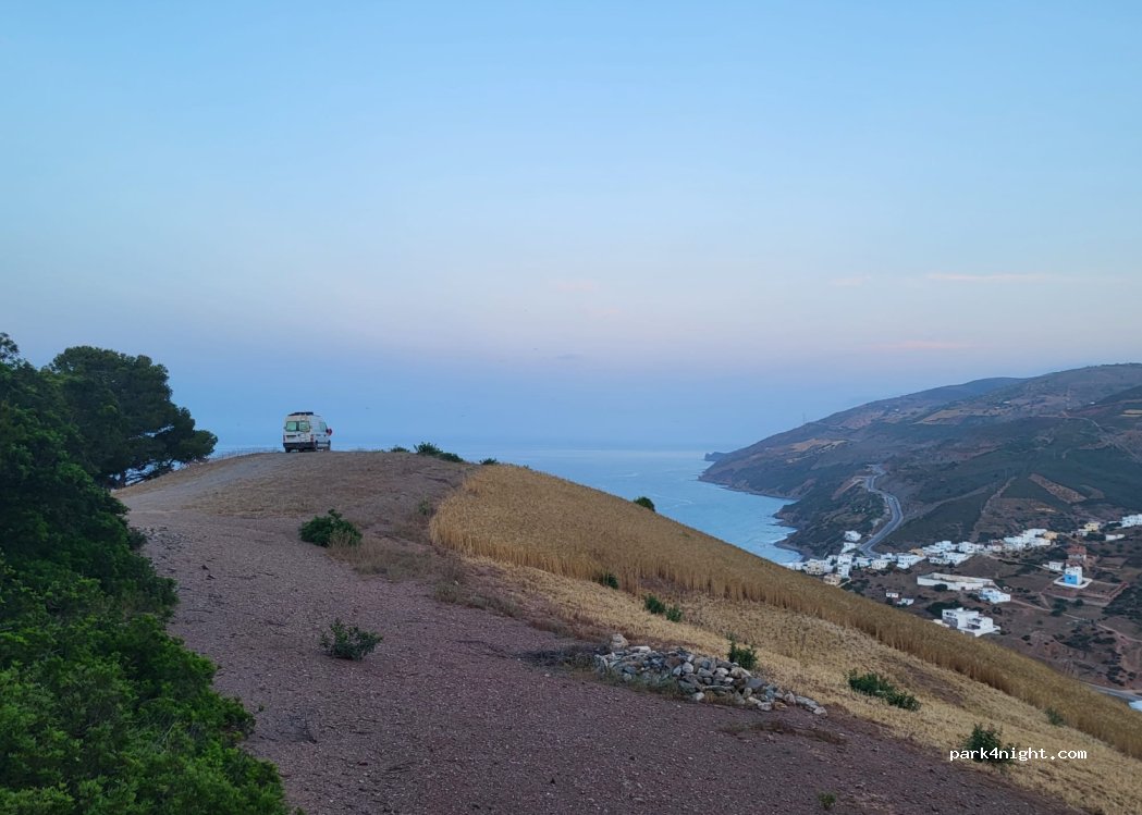 Schöner Platz für eine Nacht mit Meerblick, nahe der großen Straße. Tagsüber hört man die Straße aber nachts ist es sehr ruhig. Man kann hier sehr gut eine Nacht stehen, wenn man auf der Durchreise von oder zur Fähre ist. Von der großen Straße aus nach links abbiegen (wenn man in Richtung Norden fährt) und dann links den Berg hoch. Das erste Stück ist ziemlich steil, aber machbar (wir fahren einen T4). Man kann die Piste auch noch weiter hoch fahren, gut möglich, dass dort noch bessere Plätze kommen.