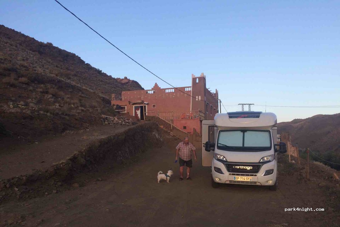Super accueil comme souvent au Maroc. Après une bonne nuit devant la propriété nous avons déjeuné chez l’ habitants car le petit déjeuner est compris dans le tarif.( 50 dhs par personne camion compris) route un peu passante. Pas de service. Merci encore à Mohamed pour son hospitalité.
