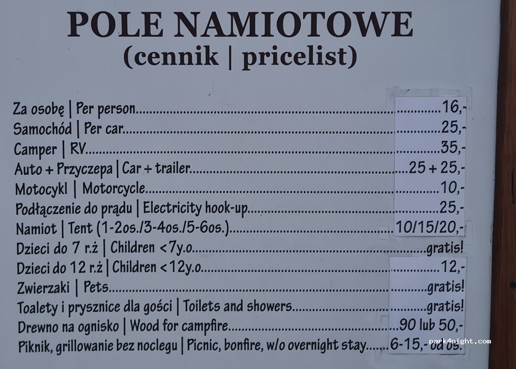 Two fields with ad hoc pitches, limited facilities for size of camp during busy periods. Bar & food reasonable, location - great scenery, ideal for walking or cycling. Cost: 60 PLN for a motorhome, 2 adults, a dog, no electrics. No grey or black water disposal available.
