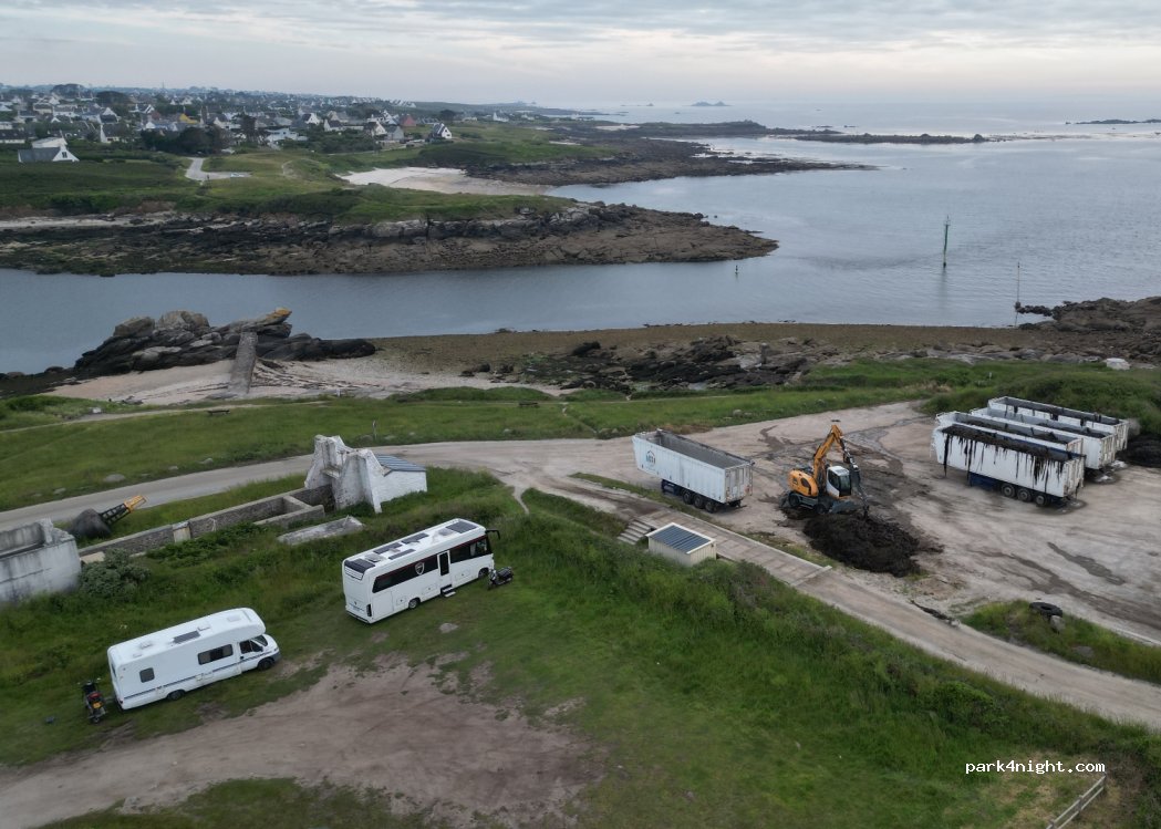 Parking idéal le weekend mais en semaine bruyant à cause des camions qui charge les algues ils sont juste devant sinon bien placé pour faire de très belles balades malheureusement aucun service ni eau ni électricité