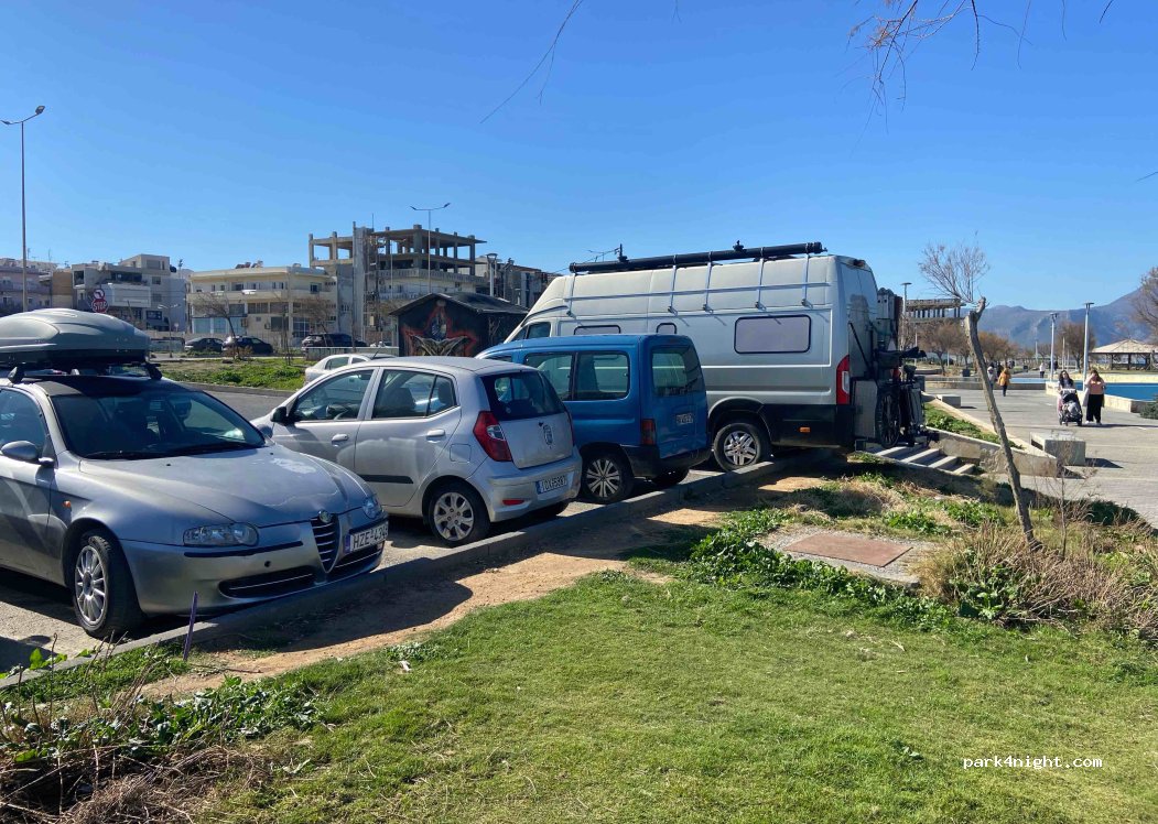 Il y a de la place pour se garer (cela se remplit davantage en journée mais le soir et la nuit, il devient presque vide). Le parking est plat, face à la mer. le centre ville d'Héraklion est accessible à pied en 30 minutes. L'environnement semble sécure, il y avait d'autres van lors de mon séjour.