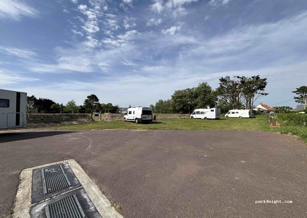 un petit terrain sur herbe plutôt plat ,face a une aire de jeux dans un environnement calme. Passé une nuit sans lumière et sans bruit, vraiment merci a la municipalité de nous offrir des arrêts aussi sympathiques . les commerces a 5 minutes a vélo ainsi que la plage. Je recommande la petite boulangerie a l'entrée,ce sont des jeunes et ils ont besoin de reconnaissance !