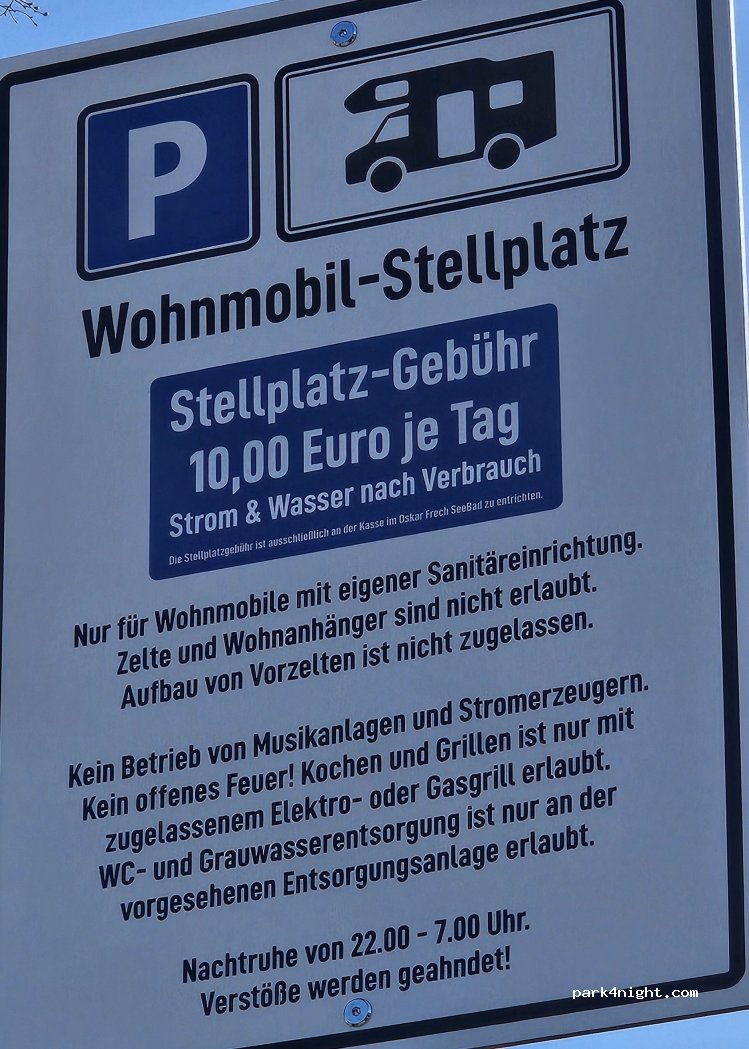 Man sollte Auffahrkeile dabei haben, ist ansonsten (zumindest für uns) etwas zu abschüssig. Letztlich ist es nur der Parkplatz, des Schwimmbades und somit tagsüber sehr voll. Dafür kostenlos. Im Foyer des Schwimmbades ist eine Toilette frei zugänglich.