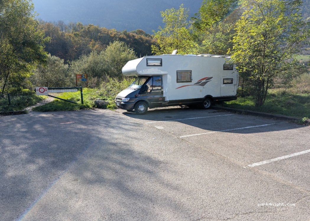 Parking at the exit of Peage-de-Vizille towards Bourg d'Oisans. Flat parking along the river slightly back from the road. Calm.