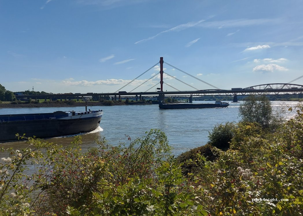 Hiking parking lot at the restaurant Rheinblick overlooking the Rhine. Public parking without restrictions. Nice view of the Rhine. Highway in hearing and sight. Duisburg district Baerl. No environmental zone. Free. Bike path along the Rhine. Since on the Rhine also at night boat traffic, the place is unfortunately quite loud.