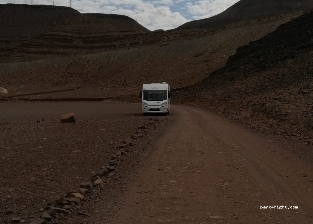Nous avons passé la nuit ici dans un cadre magnifique et tranquille. Arrivés en fin d'après-midi nous avons remonté la vallée jusqu'à la barrière qui barre l'accès au barrage. Très belles vues sur les montagnes éclairées par la lumière chaude du soleil couchant. Pour les amateurs, on trouve également dans la vallée un ksar. Un beau lieu de bivouac, et la route est bonne pour y arriver.