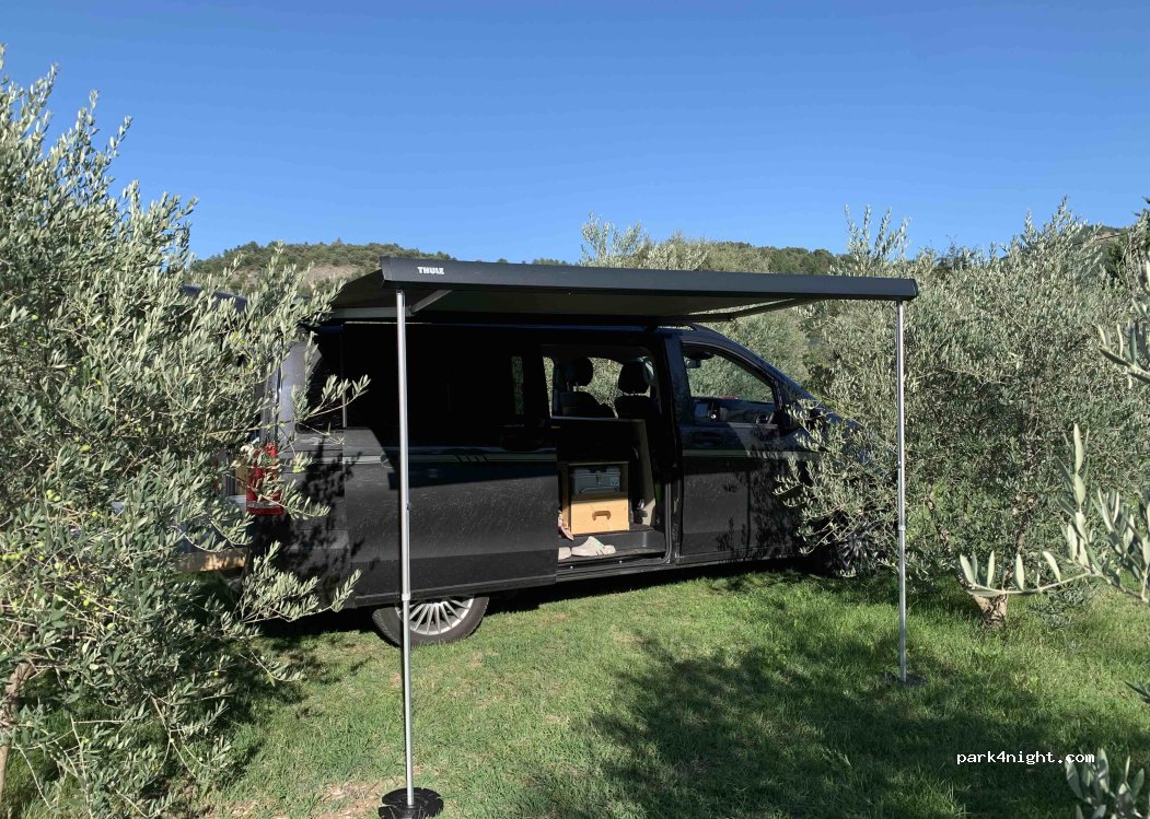 Was für ein traumhafter Ort. Man steht wunderschön im Grünen. Mit Blick in die Olivenbäume. Der Gastgeber sehr freundlich und hilfsbereit (Sprache nur französisch) sehr sauberes und großes Bad mit Dusche. Wasser Aufnahme möglich, Strom teils vorhanden. Können den Ort nur Wärmstens empfehlen.