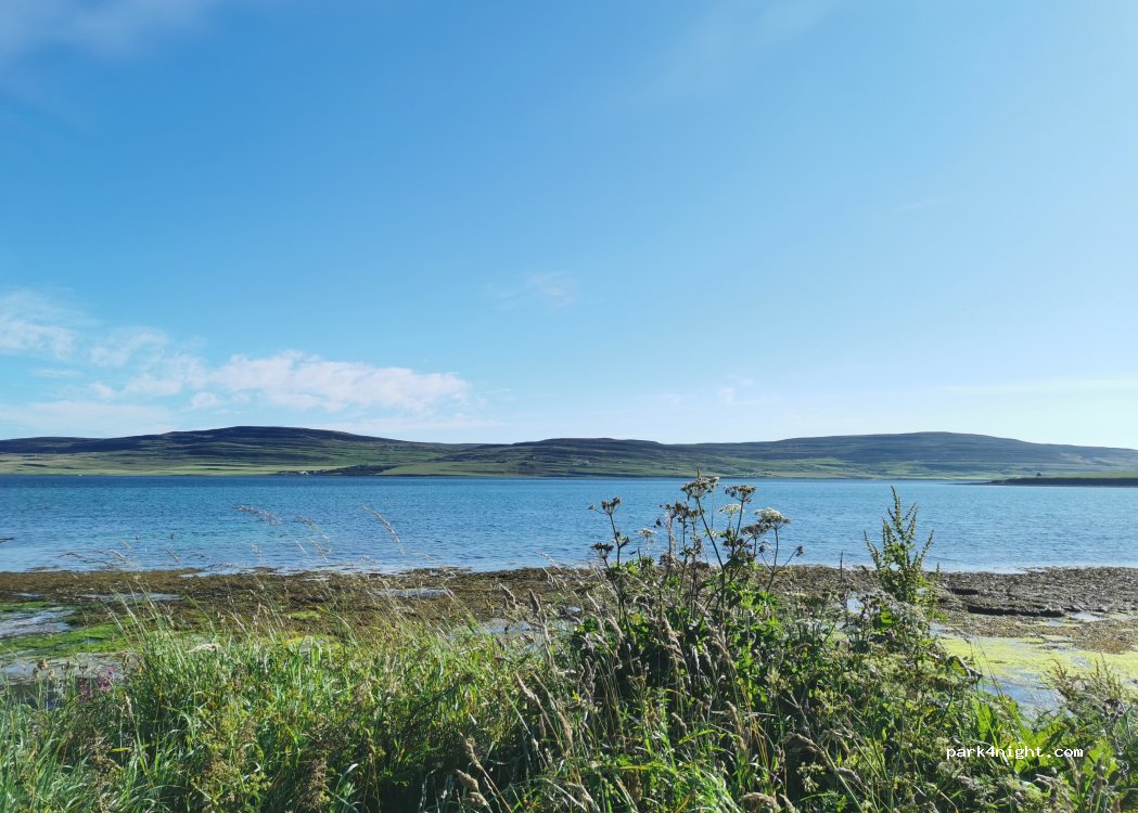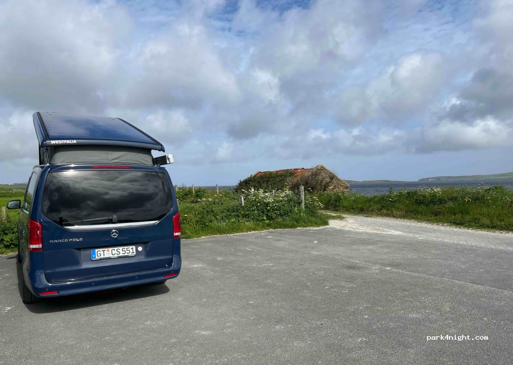 Had researched this stopover before I arrived and it didn't disappoint. Excellent views out to Rousay and the public toilets are well maintained. I arrived very late from the ferry so did a very quick park and set up. Worthy of note is that a lot of locals use the car park in the mornings for wild swimming and dog walking, so make sure you park with that in mind.