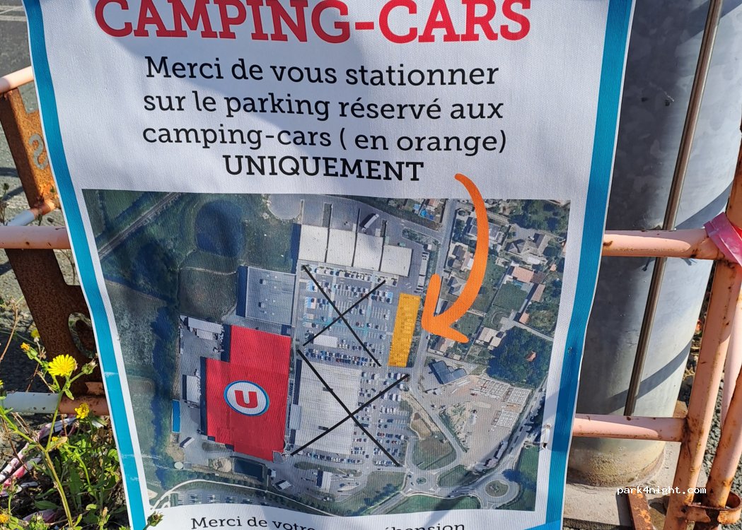 Parking vaste pouvant accueillir tout type de camping-car. Très calme. Magasin Super U très agréable. Merci de penser aux camping-caristes.