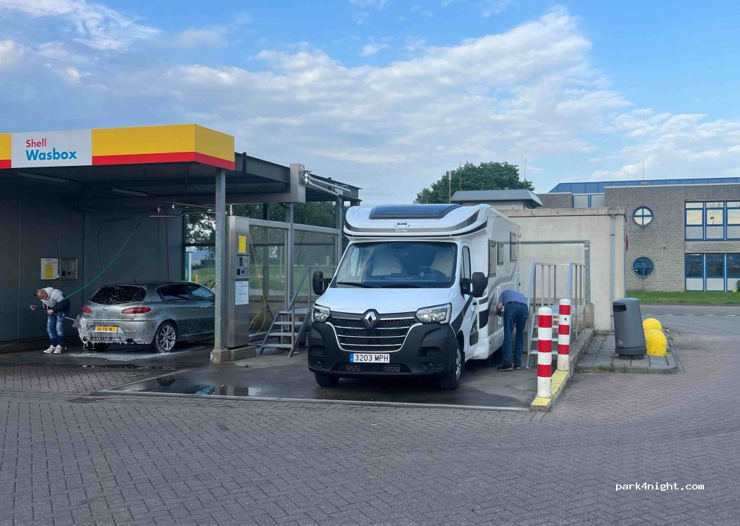 Bij het Shell tankstation bij de wasboxen. Servicepunt, gratis leegen van het grijze water, cassette toilet leegen, Het spoelwater voor het toilet heeft alleen druk door 50cent 1 of 2 euro toe te voegen in het wasbox-bedieningspaneel en op de knop (Drink)water te drukken. Drinkwater gaat ook via de automaat van de wasboxen. Schone locatie, gratis wifi.