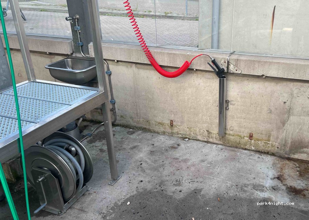 Alla stazione di servizio Shell vicino alle cabine di lavaggio. Punto di servizio, svuotamento gratuito di acque nere e servizi igienici. L'acqua di scarico della toilette ha pressione solo aggiungendo 50 centesimi nel pannello di controllo dell'idrolavaggio. L'acqua potabile ottiene la chiave alla stazione di servizio. Posizione pulita, Wi-Fi gratuito.