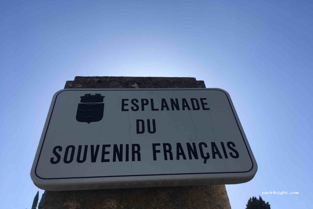 Parking in the village cemetery: "Esplanade du Souvenir français". Quiet spot in the heights of the city near the central square of the village with cafes. Also close to a business and bakery. Shallow place. Drinking water point available. My brother living in the city. We did not spend the night there but the place seems quite suitable for a stopover day or night.