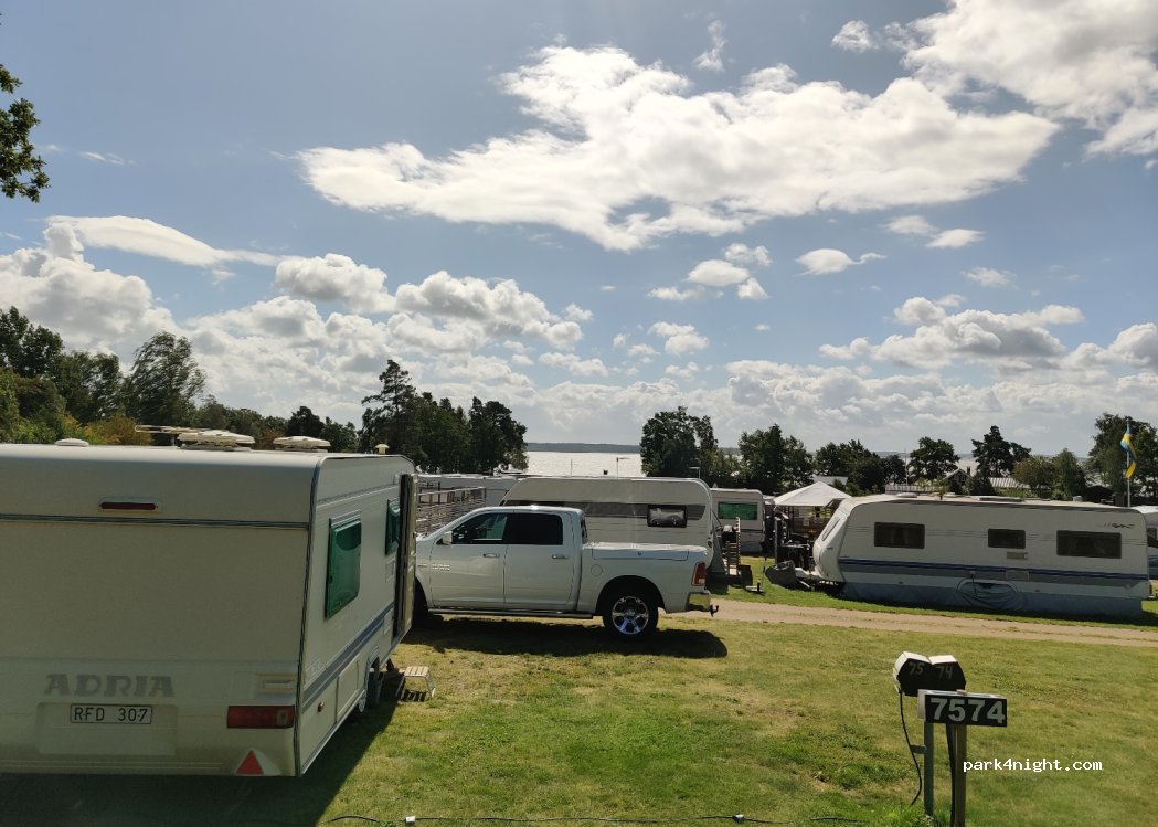 7 quickstopp Stellplätze an der Rezeption. Auf dem Camping Platz kann man glücken einen der 10 für Camper reservierten Plätze (121-129) ergattern. Hat bei uns 280SEK die Nacht gekostet. 10SEK fürs duschen. Direkt an einem schönen Badestrand. Schöner Spielplatz für Kinder. Waschmaschinen sind auch vorhanden.