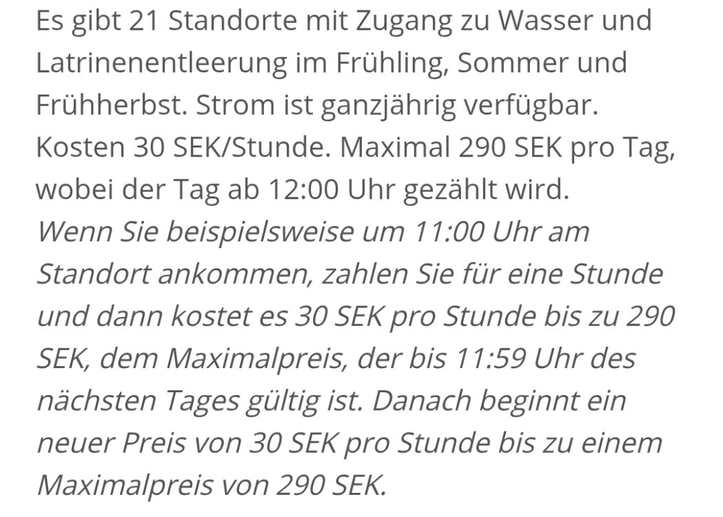 Der Platz hat uns gut gefallen. Wir haben für 25 1/2 Stunden 250 SEK bezahlt. Wir waren um 10.30 Uhr da und haben leider keinen Platz mehr in der ersten Reihe bekommen. Heute war zur gleichen Zeit noch einiges frei in Reihe 1. Das „große Abreisen“ setzt so gegen 9.00/9.30 Uhr ein, am frühen Nachmittag sind alle Plätze belegt. Die Duschen und Toiletten sind fußläufig zu erreichen und zwar alt, aber sauber und gratis zu benutzen.