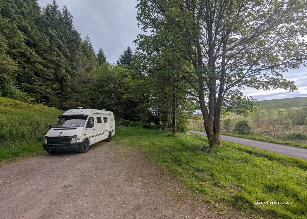 The pin took us to a layby called Tonugey Faulds forestry car park. We arrived late at night and overnight parking allowed. So quiet and pitch black. Good Spot and just off the road.