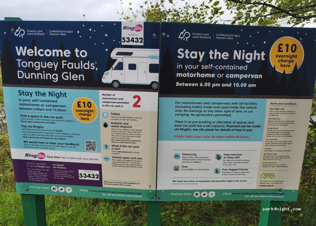 This car park is called Tonguey Faulds. Its remote, quite flat, could be muddy, no signs seen to say you can't overnight here. I would recommend.