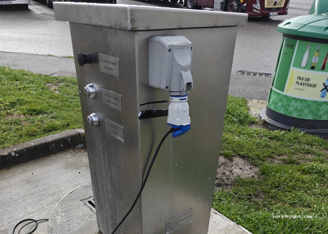 Despite being near the autoroute, airport, and seemingly wedged between two main roads, the parking is set back from the road and got a peaceful night’s sleep. So just by the EV chargers was nice, with a picnic bench. Coffee, croissants in the morning. Open, obviously! 3m height limit, to keep out the trucks.