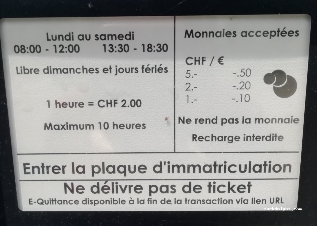 Très bien pour vans, fourgons 6 m maximum, mais attention côté marquage au sol bleu, stationnement avec disque limité à 1 heure et interdiction en Suisse de dormir sur les parkings, il faut aller dans les campings. Information d'un sympathique fonctionnaire local, amende à l'appui pour bien que j'enregistre le message.