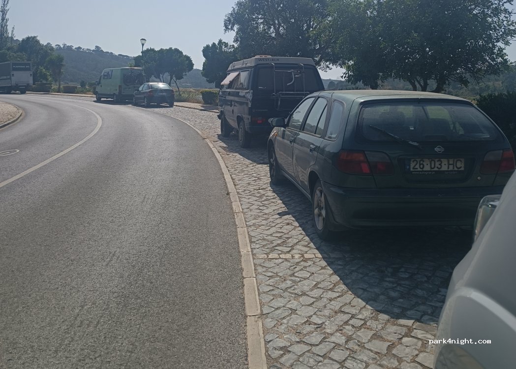 Nosotros aparcamos al final de la calle pegado una plaza donde por la noches pasan el rato la gente tomando cerveza y pasando el rato. ademas la calle esta muy transitada por coches y furgonetas. el sitio esta bien y se tarda pocos minutos en llegar al centro del pueblo. pernoctamos aquí porque la GNR paso por la playa advirtiendo que no se podia dormir en la propia playa