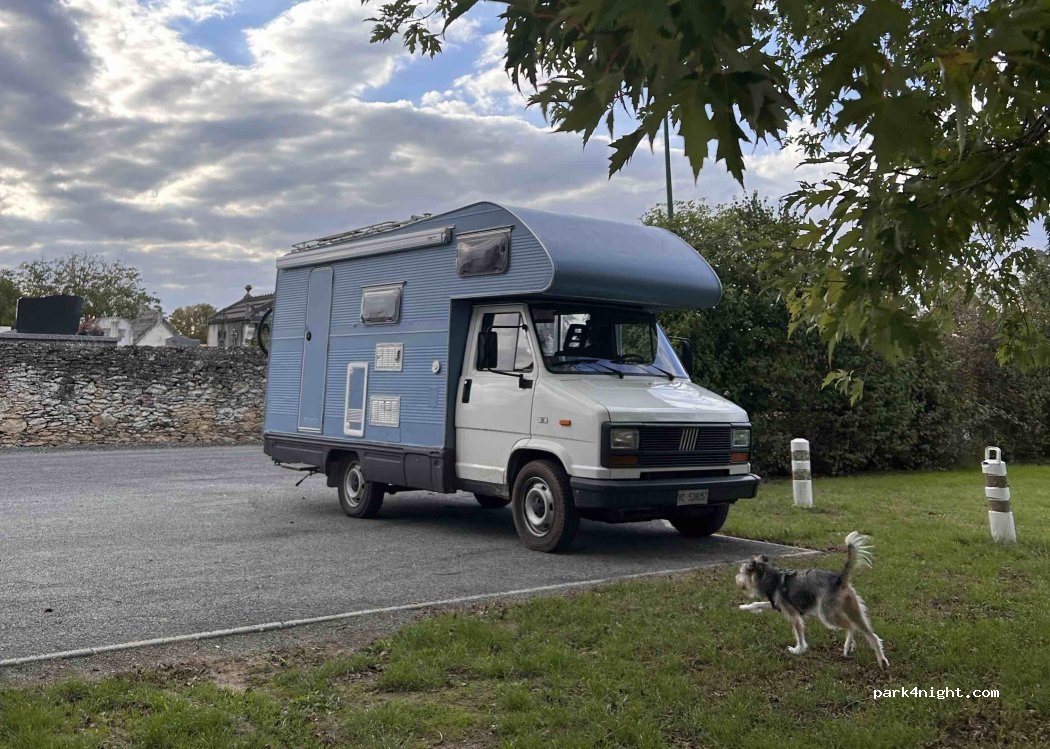 Quatre places sur gravillon en face du cimetière, à côté de plusieurs terrains (foot, tennis, boulodrome ect) mais pas beaucoup de passage, ça reste la campagne. Arrivée d'eau et toilettes publiques, seul "défaut" l'église à proximité qui sonne (la journée).