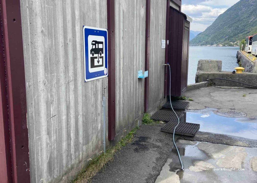 Die Servicestation ist vorhanden, der Parkplatz davor ist mit dem Schild "No Camping " versehen und der Parkplatz um die Kurve am Hafen, ist Teil des Wohnmobil Stellplatz mit 300NOK für 24h am Parkautomat zu bezahlen