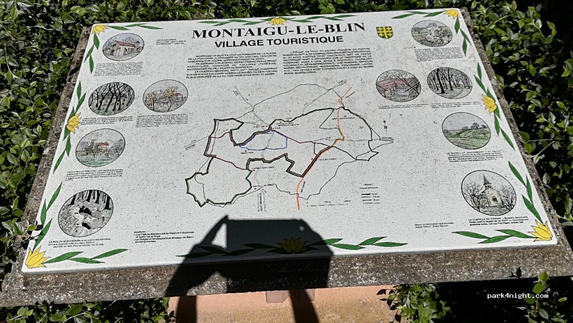 En la gran plaza del pueblo, pequeño aparcamiento bajo los árboles, detrás de la antigua báscula. Sin servicios El lugar es enorme, 2 restaurantes. Fortaleza visitable los domingos y festivos. Un poco de tráfico hasta las 9 p.m.