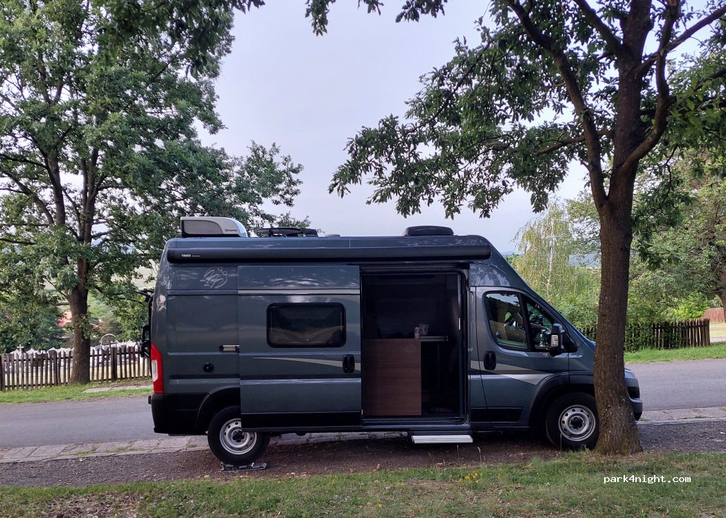 Klidné místo na velkém parkovišti vedle hřbitova. Zdarma možno parkovat od 18:00 do 9:00. Parkovací místa nejsou úplně rovná. Toalety otevřené jen přes den a jsou placené.