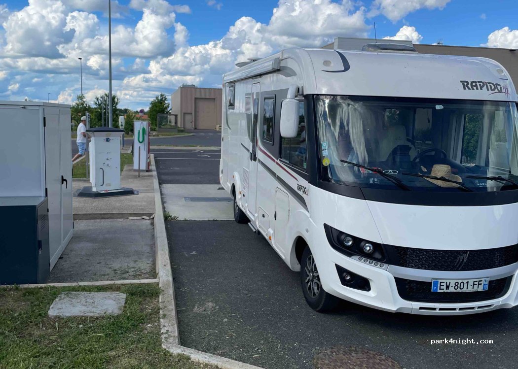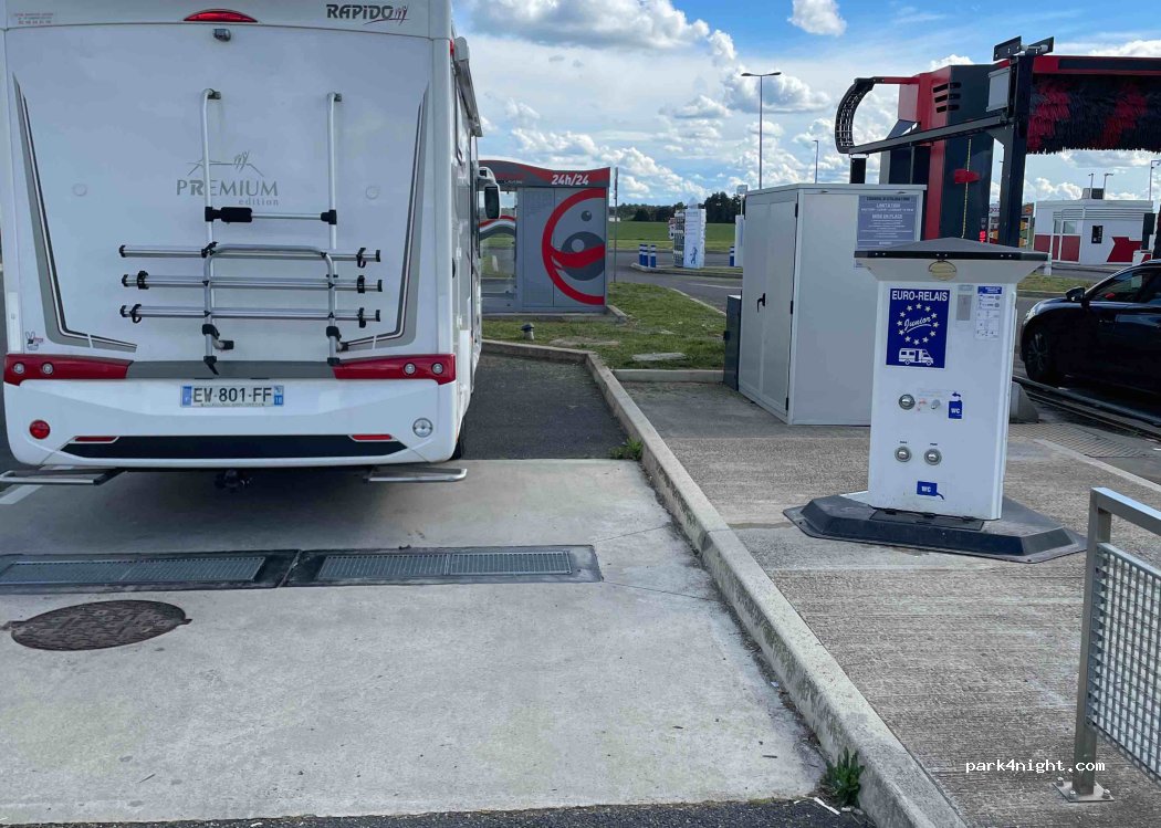 Très propre et pratique. pendant que je fais les services madame fait les courses. vidanges gratuites. sinon pour les pleins : 1 jeton "euro service" :100 litres où 1 hs d'électricité