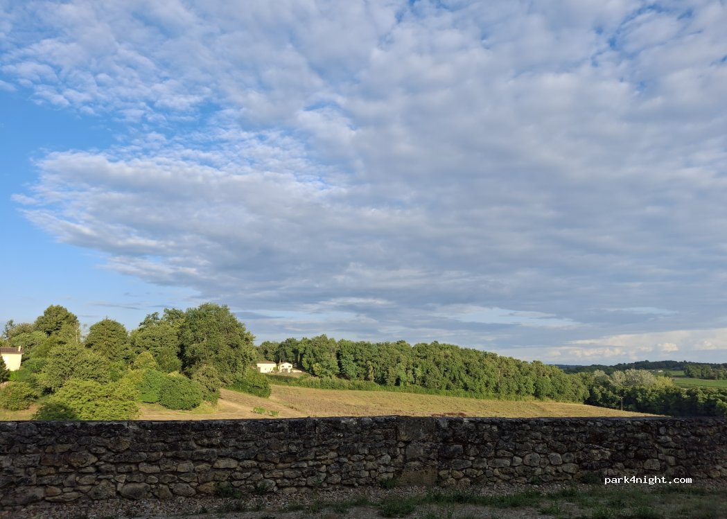 Tizac of curton. Walk around the church following the direction parking. From the main road. Parking day and night. A night without noise ! alone. Very kind.