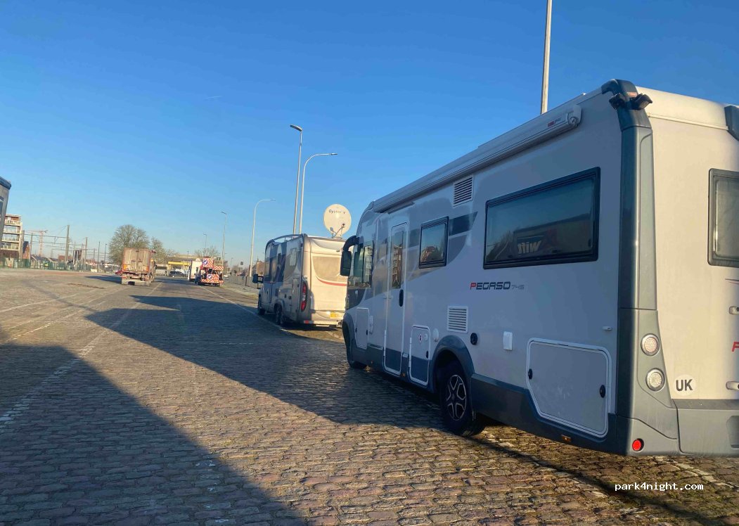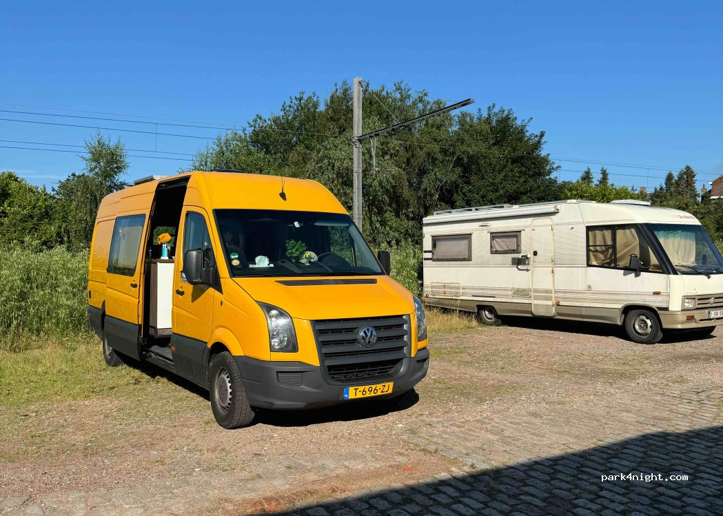 We stayed one day and one night. Noisy, but as a good camper I always have earplugs and I heard nothing. Otherwise great spot, flat, always enough space, close to town (13min walk to the Flanders Fields museum), next to the train station. Supermarkt (Delhaize), a gas station and a kiosk closeby. There were 3 other campers with us here overnight.