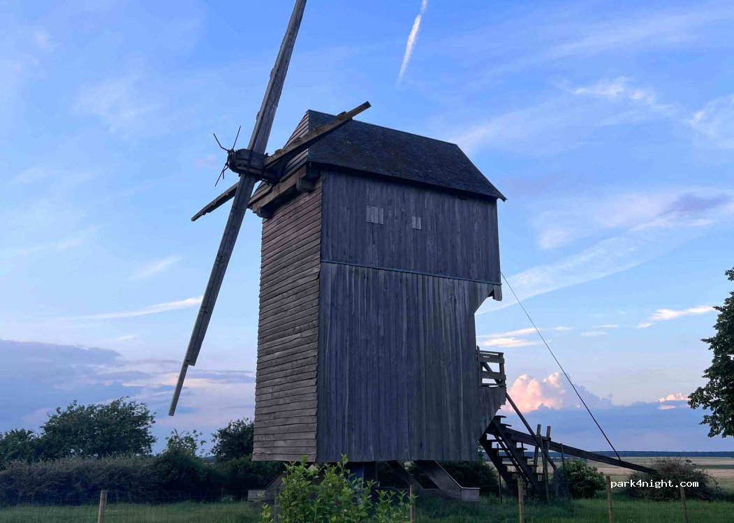 Small car park on the side of a country road and 50 meters from the main road. Beautiful view of the plain at the foot of a windmill being restored, you may come across one of the volunteers who takes care of this charming mill! a concrete picnic table but without shade. A place to leave clean of course ;)