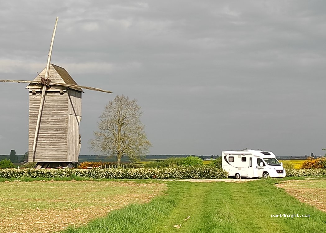 Petit parking en bord de route de campagne et à 50 mètres de la départementale. Belle vue sur la plaine au pied d'un moulin à vent en cours de restauration, vous y croiserez peut-être l'un des bénévoles qui s'occupe de ce charmant moulin ! une table de pic-nique en béton mais sans ombre. Un endroit à laisser Propre bien entendu ;)