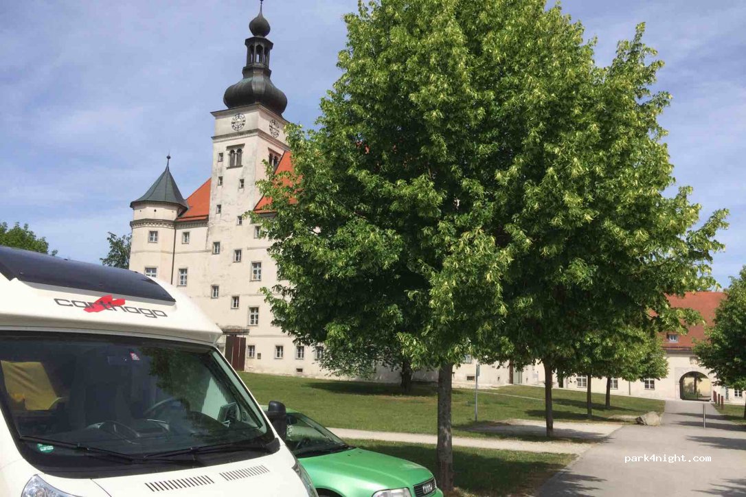 SCHLOSS HARTHEIM - geschotterter großer Parkplatz. Ein Mitarbeiter des Schlosses teilte mir mit, dass Wohnmobile hier gern übernachten dürfen, trotz der Tafel PRIVATPARKPLATZ. Bitte benehmen Sie sich hier besonders rücksichts- und pietätsvoll: wenn Sie sich über die tragische Geschichte des Schlosses informieren oder sogar eine Führung mitmachen, werden Sie verstehen warum. Sehr empfehlenswert auch der Shop MANUFACT und das Cafe LEBENSWERT. Und seien wir uns täglich dankbar bewusst, welch Riesenglück wir hatten, dieses Schicksal nicht erleben zu müssen.
