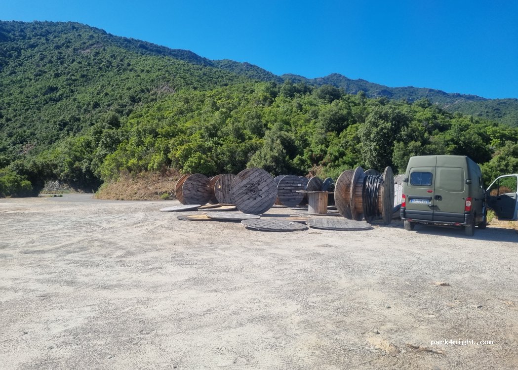Spot assez simple qui fait le boulot pour une nuit. Il y a des bobines de câble de part et d'autre qui sont pratiques pour cacher son véhicule. Le lieu est plat. Beaucoup de déchets malheureusement et de moustiques aussi. Peu de passages la nuit, nous n'avons pas été embêtés. Vers 8h les gens arrivent pour prendre des photos.