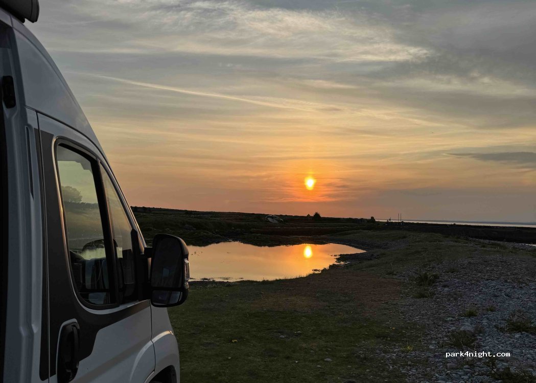 Lovely park up especially if you have dogs, large beach to give dogs a run on safely. We decided to stop travelling and spend the day here. Access to the site is only at low tide at high tide the sea comes in around the harbour putting you on a little island. Beautiful sunset and sunrise. Locals come and walk dogs and a couple of swimmers.