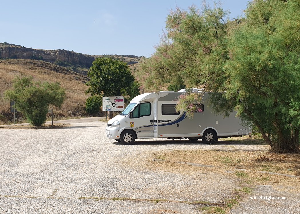Parking publico de autobuses a la entrada del pueblo, y a 5 minutos (por un sendero), de el comienzo de una ruta de las hoces del Duraton, Dormimos solos dos noches super tranquilos sin ruidos ni molestias. un sitio de 10 sin ser área. Paso la guardia civil y no nos dijo nada. Repetiremos sin duda