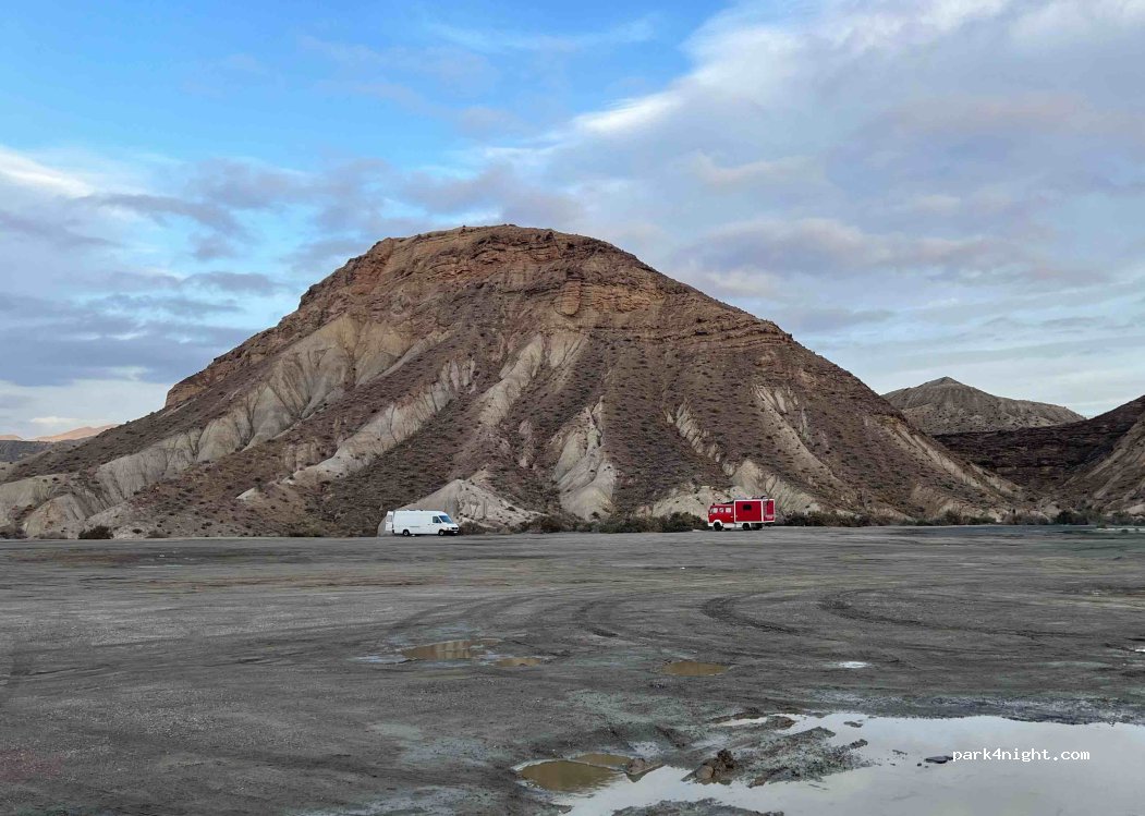 Großer Sandparkplatz in ausreichenden Abstand zur Tankstelle mit tollen Panorama auf die Wüste von Tabernas. Die Landstraße ist 100 Meter entfernt. Die Autobahn dahinter, so dass es nur ein erträgliches Grundrauschen bei geöffneten Fenster gibt. Auch Abhängig von der Windrichtung.