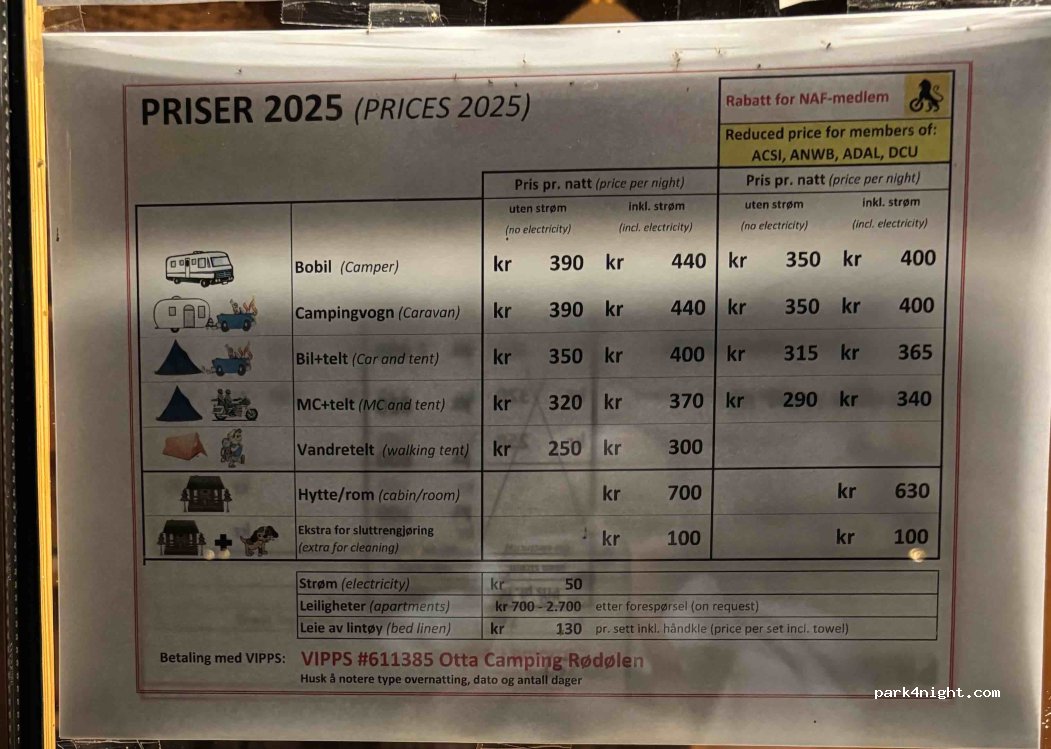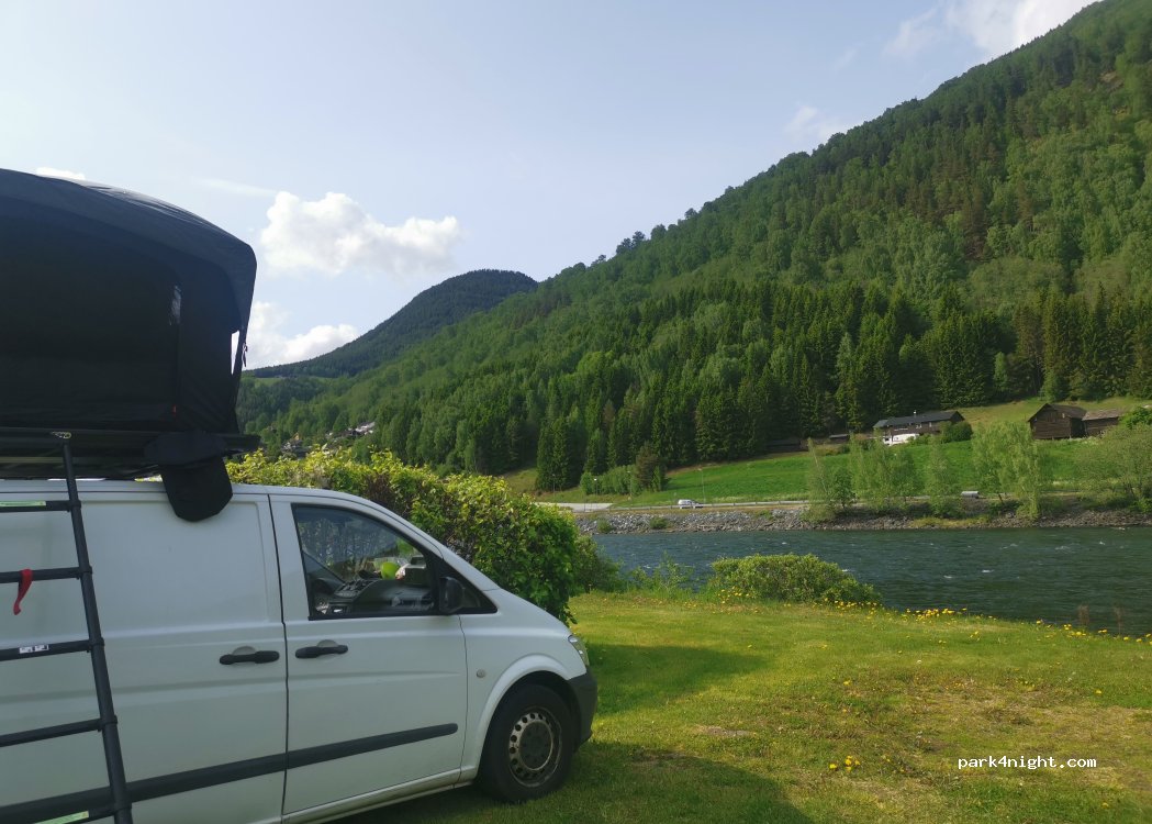 Dejlig plads lidt uden for Otta. Ligger ned til elven. Kan desværre ikke betale med kort, kun kontanter eller vipps. Man kan holde hvor man vil - der anbefales 4 m mellem vognene.