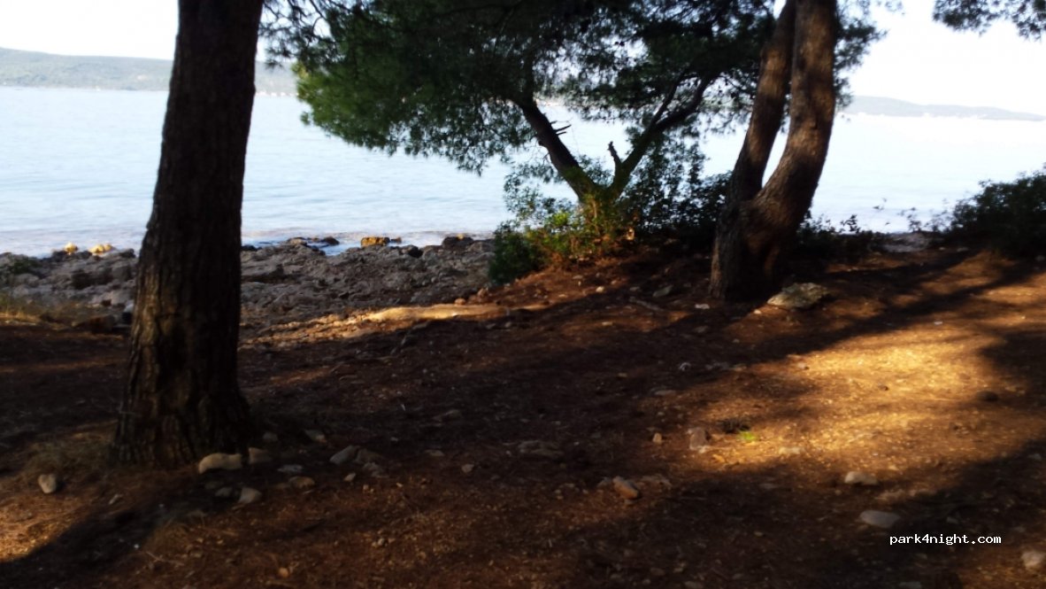 Signs said it’s forbidden. The house where you can buy parking tickets is completely destroyed so the parking is also “for free”. It is a very beautiful place between trees right next to the sea. The street only a few meters away is quiet busy. Unfortunately trash and broken bottles so be careful!