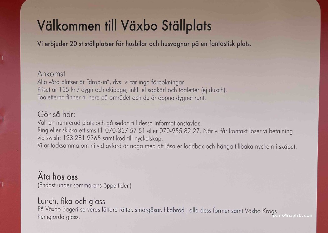 Parkeerterrein met 20 plaatsen voor campers. Nummer 20 heeft schitterend uitzicht. Naast het terrein ligt Växbo museum met een goed restaurant, een paar leuke winkeltjes en een bakkerij met leuk café erbij. Hiervandaan loop je via bospaadje naar de linnenweverij met winkel. Kosten zijn sek 125 incl electra.