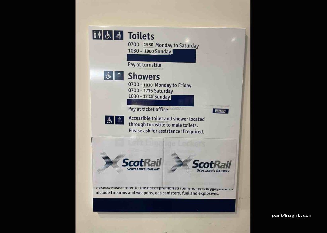 Showers are available in the train station, hours are listed in the photos. Revolution Laundry next to Morrisons, usual pricing applies.