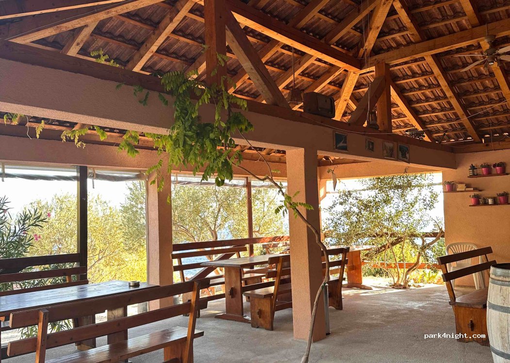 CAMP ALOA BOL – on the terraces – 5 different levels, with 8 pitches for motorhomes from 5 to 7 meters on the upper terrace only, the remaining pitches are suitable for small trailers. Very steep slope, bathroom facilities at low level. A typical water sports spot. Beautiful views of the sea from the restaurant/café, beach/rocky coves for swimming, very clear sea, and clean bathroom facilities.