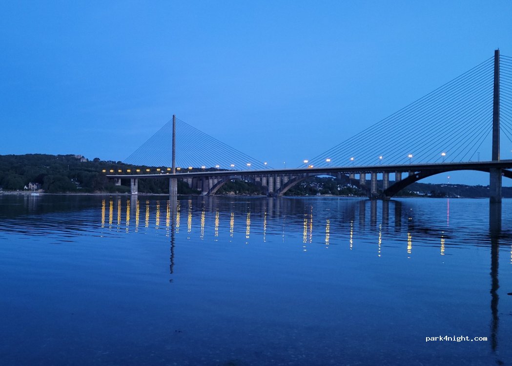 Stationnement sur un parking avec vue magnifique sur l'Elorn et le pont d'Iroise. Accès très étroit à éviter pour les intégraux et plus 7 mètres