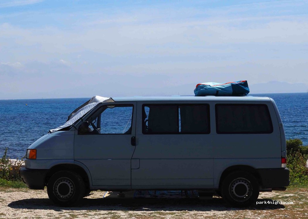 A parking lot with sea view, 2m limit, so only for small buses or cars. During the day, the locals come to the beach, at night is relatively quiet. There is a shop that you can walk to quickly. But you should have everything because the store is slightly overpriced.