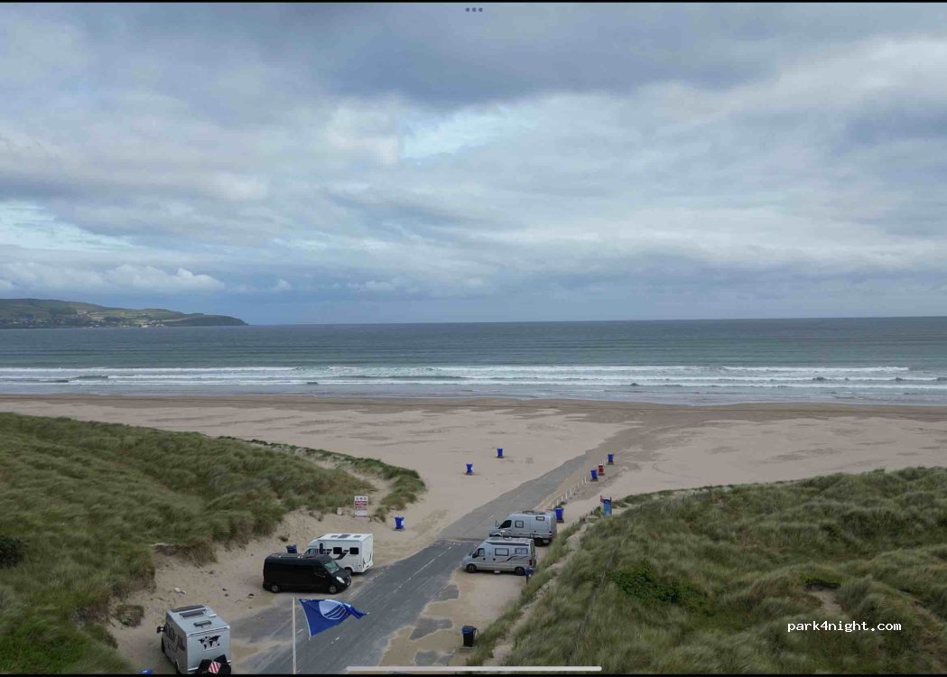 One of the best beaches in Ireland! You can drive onto the beach, park up and enjoy. Great facilities - showers and toilets. Wee cafe open at the weekends. There's a sign saying no camping or overnight parking on the beach, but nothing to say that you can't stay overnight in the parking bays before the beach. Enough room for a few campervans, but in the height of summer it does get busy.