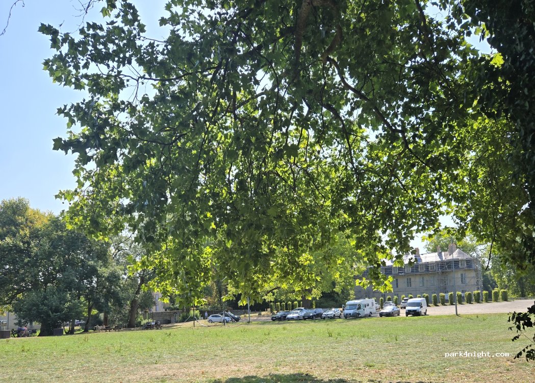 In front of the castle behind the parking. Picnic area (tables and benches), on the banks of the Sarthe. No toilet. Near downtown.