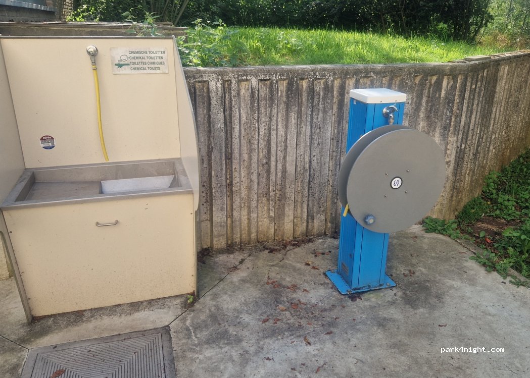 Reinigen van chemische toilet is mogelijk alsook lozen grijs water. Water tanken is niet mogelijk (buiten dienst). Toch bedankt aan de gemeente om de faciliteiten te voorzien!
