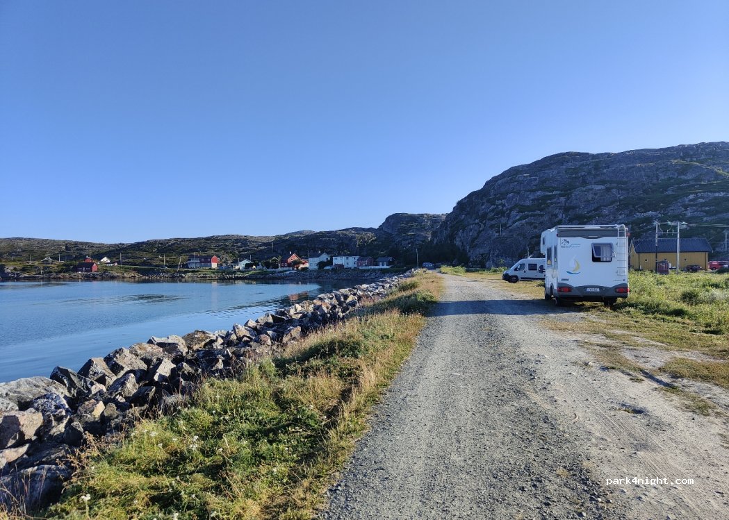 Super spot. Vue magnifique et soleil plein Est le matin. On y a passé 2 nuits hyper calmes. Il y a un robinet d'eau sur le port ,devant le Bistroen,resto très sympa, mais assez cher. On y a goûté le fameux Norway King Crab. Sans plus pour nous. On a fait l'Artic Sauna, à l'entrée du village, alors là, Sauna et bain de mer enchaînés, c'est hyper top. pour 25€, ça vaut vraiment le coup.