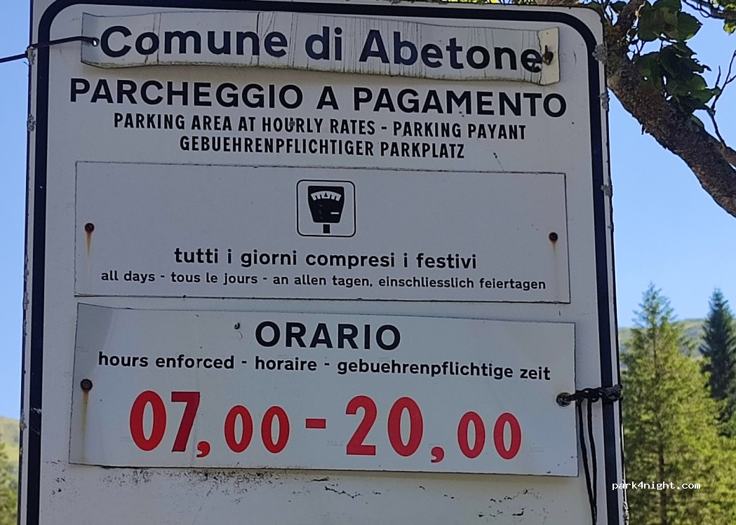 10€ per 24ore, tutto compreso, anche l'elettricità. Molti posti. Griglia per lo scarico di difficile accesso. Fondo dissestato. Paese raggiungibile a piedi con negozi aperti sempre. Partenza di molti sentieri e seggiovia aperta sempre. Il biglietto del parcheggio vale anche per gli altri parcheggi dell'Abetone.