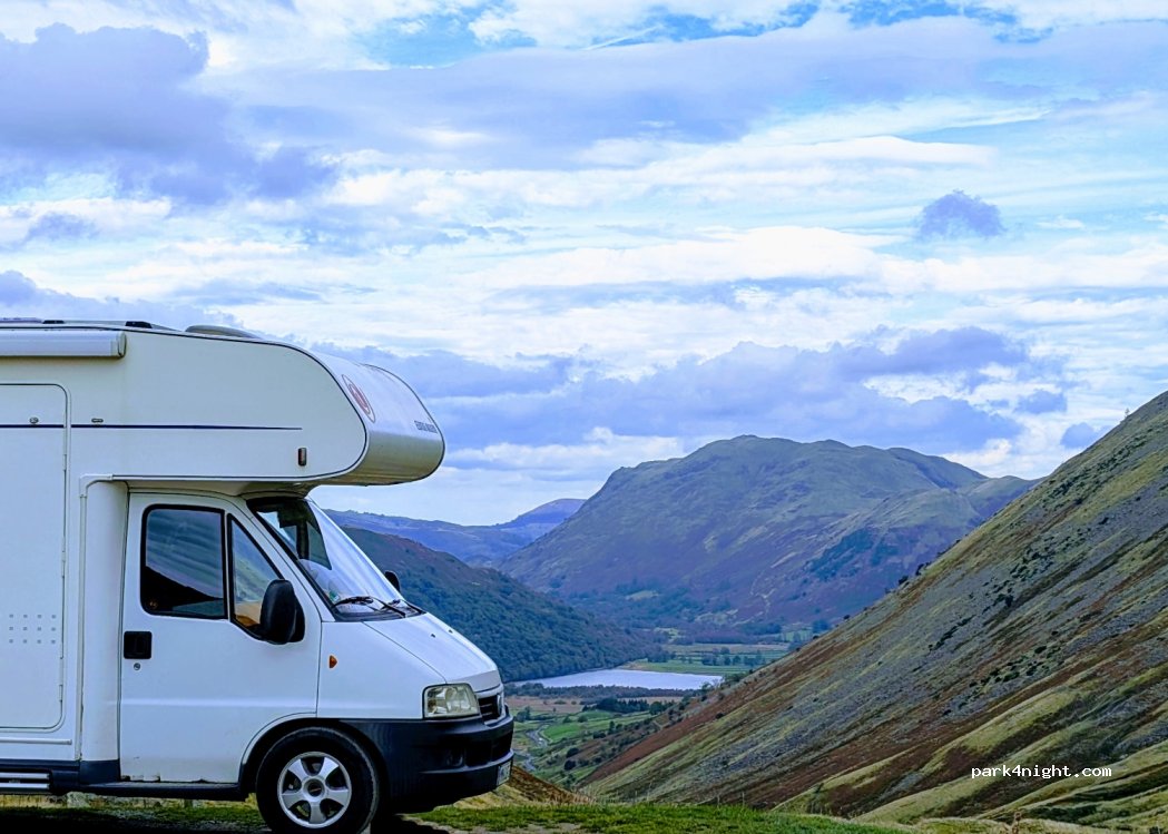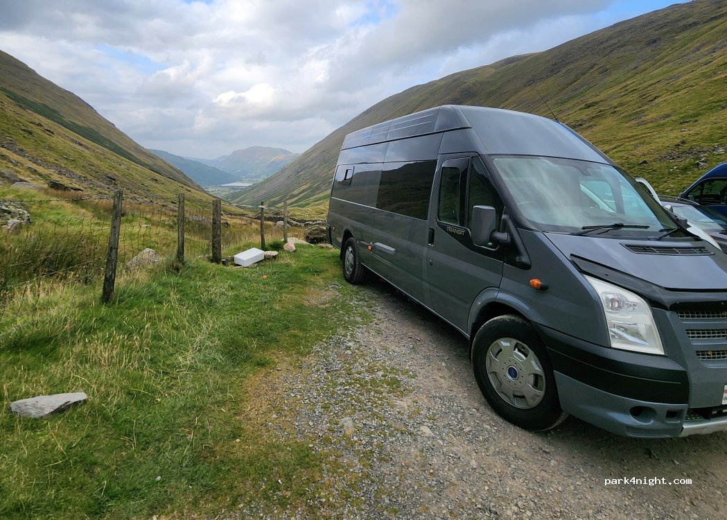 Small gravel car park with great views down to Brothers Water. Room enough for a 4/5 campers but only one side is level. Very quiet after 9pm, good night's sleep and nice walk up the hill in the morning.